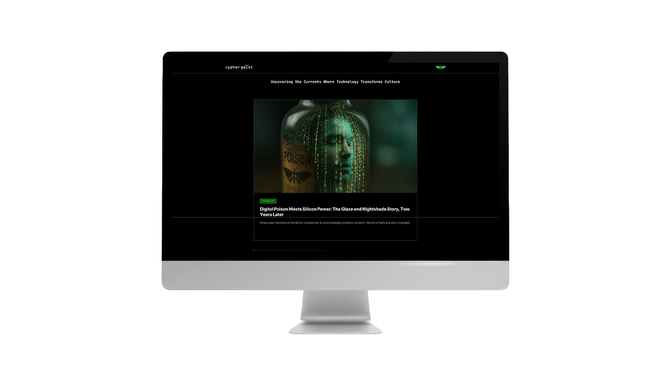 As Editor & Creative Director, I built the Cyphergeist brand identity, the editorial voice, the visual system, and the entire UX for the site. I write long-form pieces, create the custom imagery, and define the overall creative direction — from risograph-inspired aesthetics to the way we visualize stories about technology and culture. It’s both an editorial lab and a creative playground where I test approaches to narrative, design, and emerging tech.