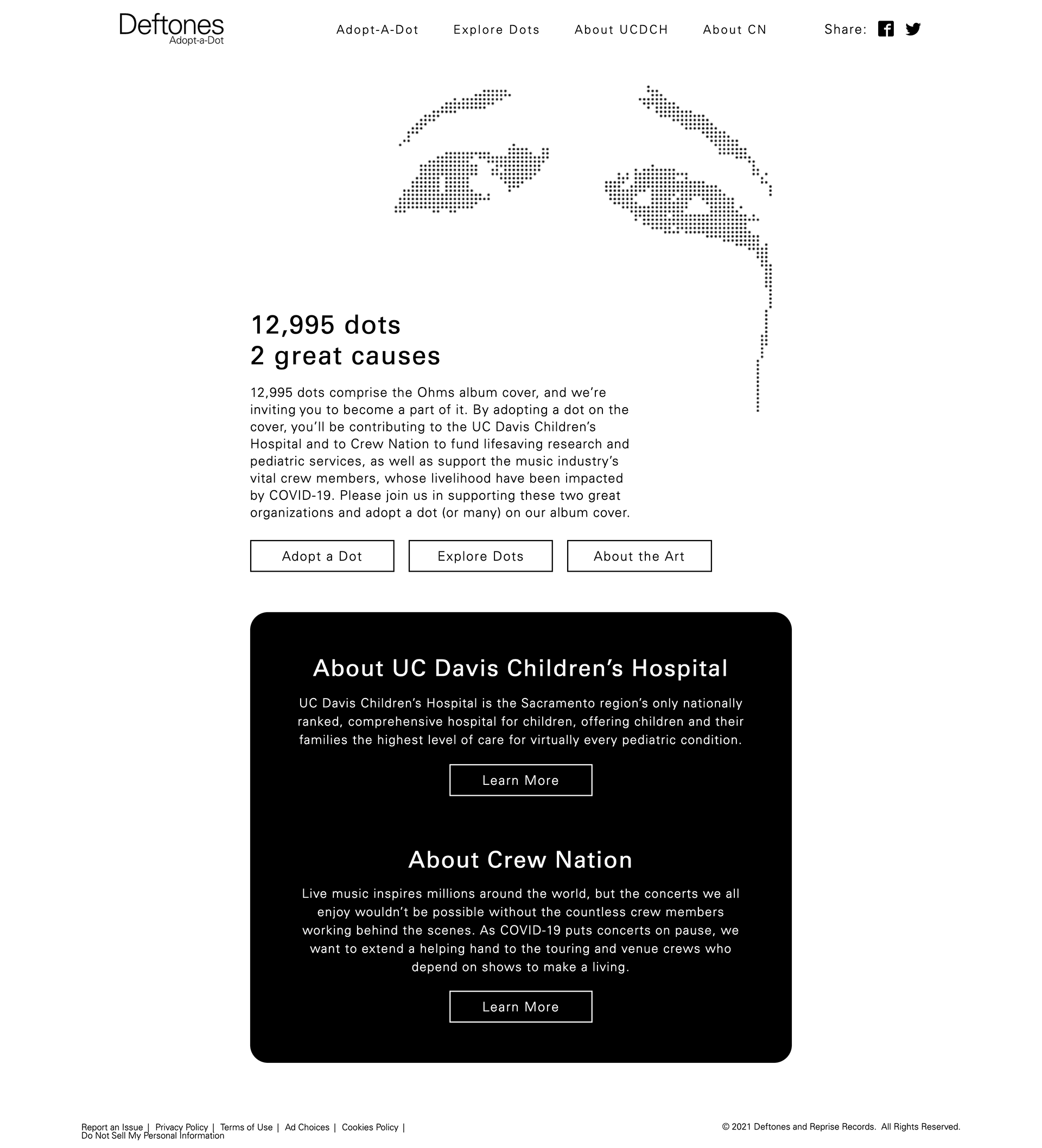 In 2020, the band wanted to launch a campaign to raise money for charities during the Covid-19 pandemic. The resulting execution was Adopt A Dot which allowed fans to purchase one of the thousands of dots in the OHMs album artwork. The campaign was a success, raising over $100K to be split between Crew Nation and The UC Davis Children's Hospital.
